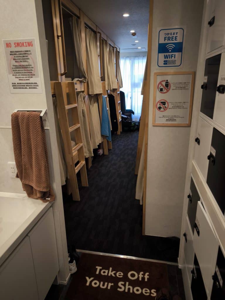 5 storeys of large rooms filled with 20 capsule bunks. They have a privacy curtain, a light and plug socket, and a firm, springy mattress topped with a lightweight duvet. Honestly, for so cheap, I thought it would be awful, but it’s clean, tidy, and spacious… enough.