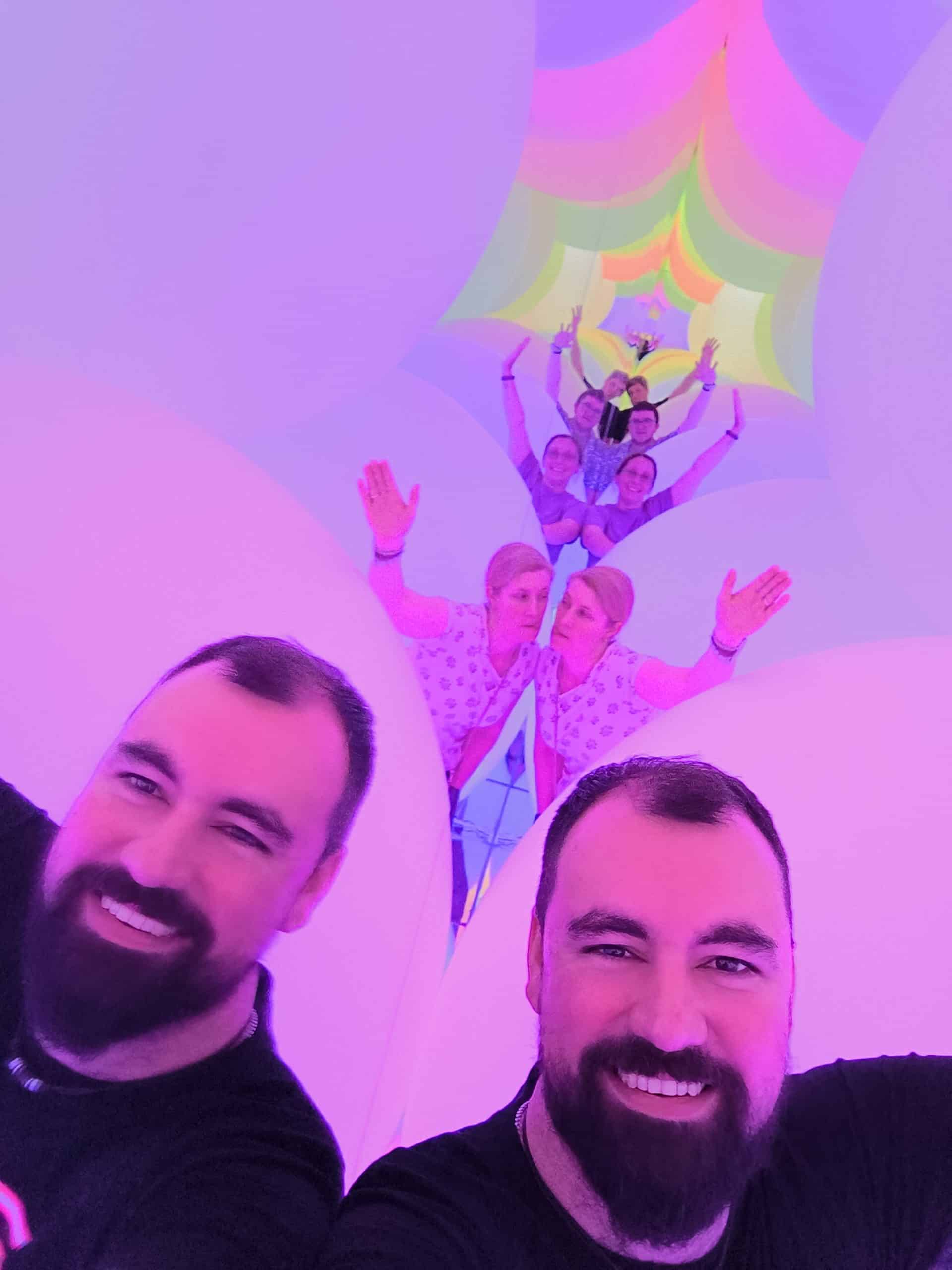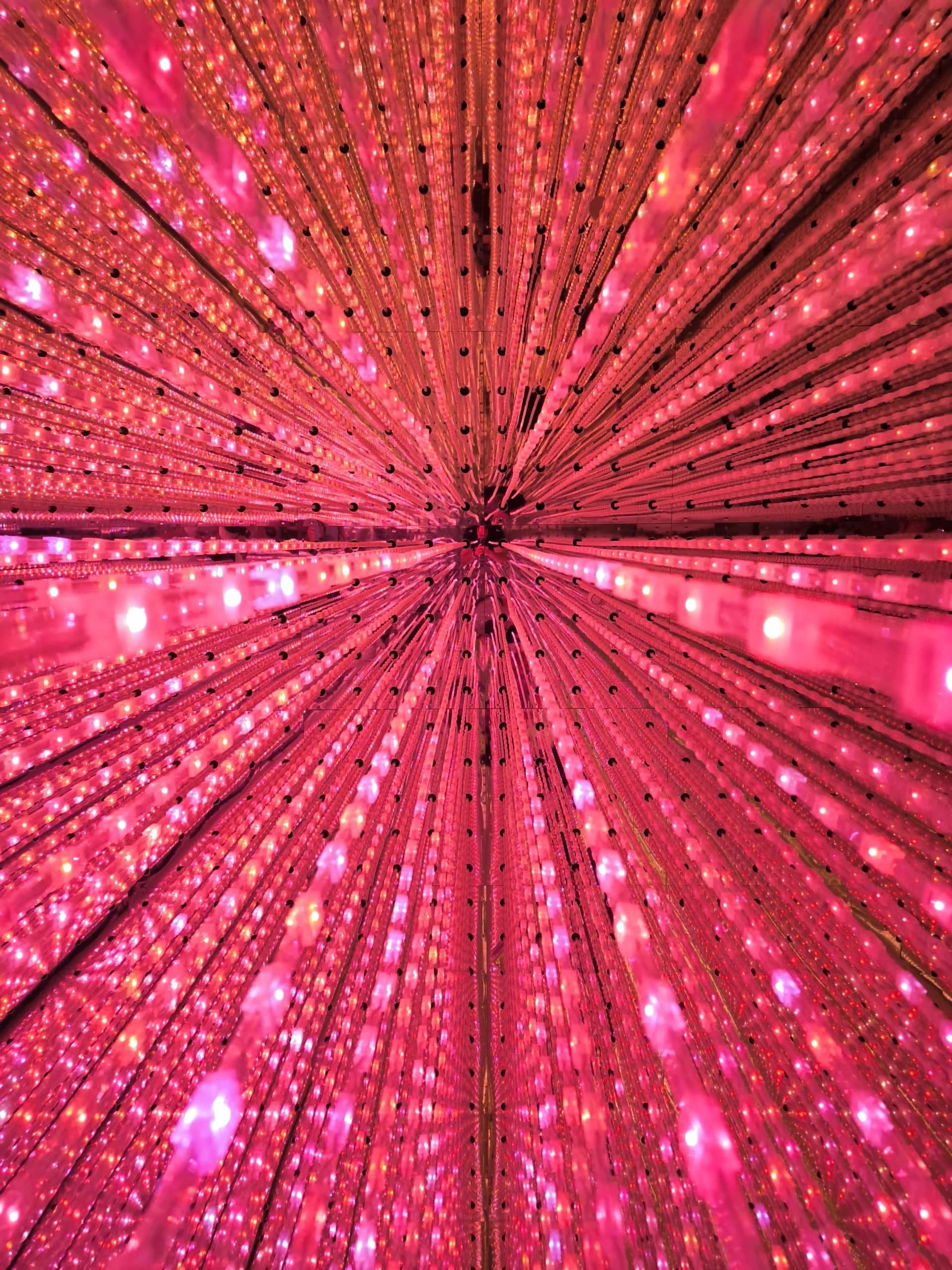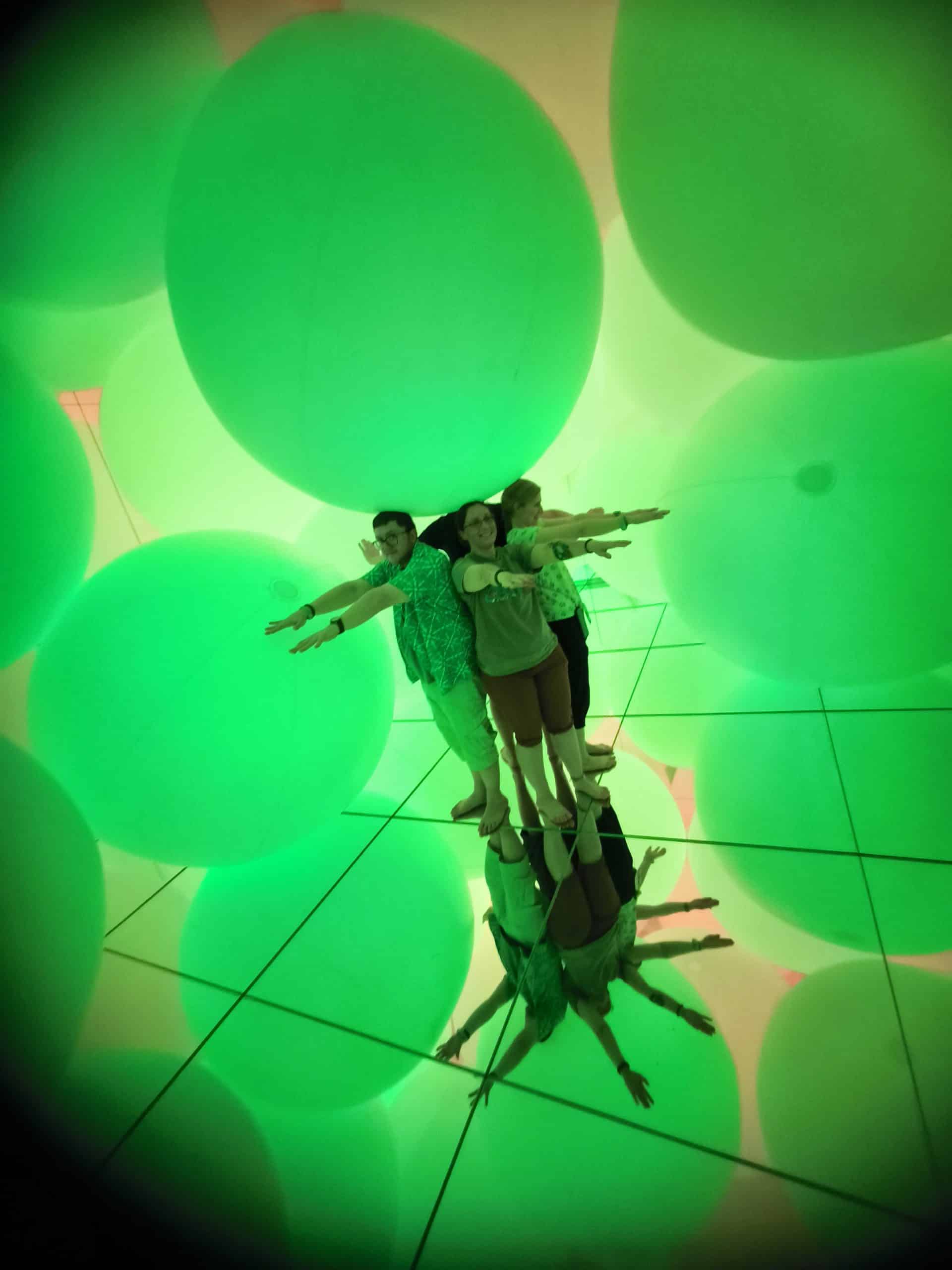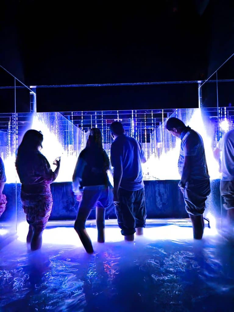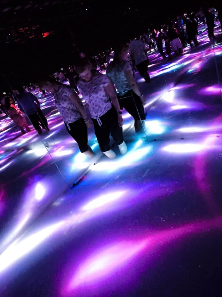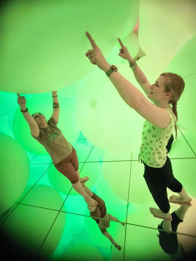 The infinity light galaxy and the carpy water were still the best rooms, but this time they also had a giant bubble room. This huge mirrored room had maybe 100 Mini Cooper-sized white silicone inflatable balls that hummed and changed colour. This really brushed up against Aimi’s balloon anxiety, but after we bounced them around for a while, they proved sturdy enough to take a beating without popping. I even belly-flopped onto one and it survived.