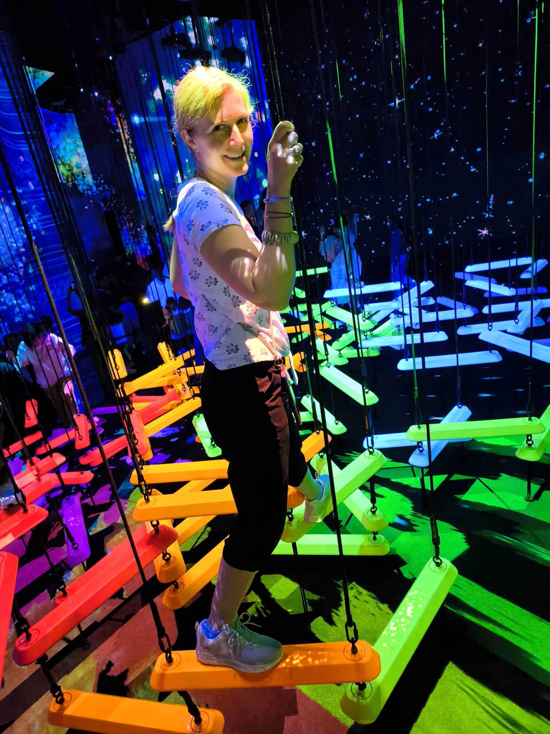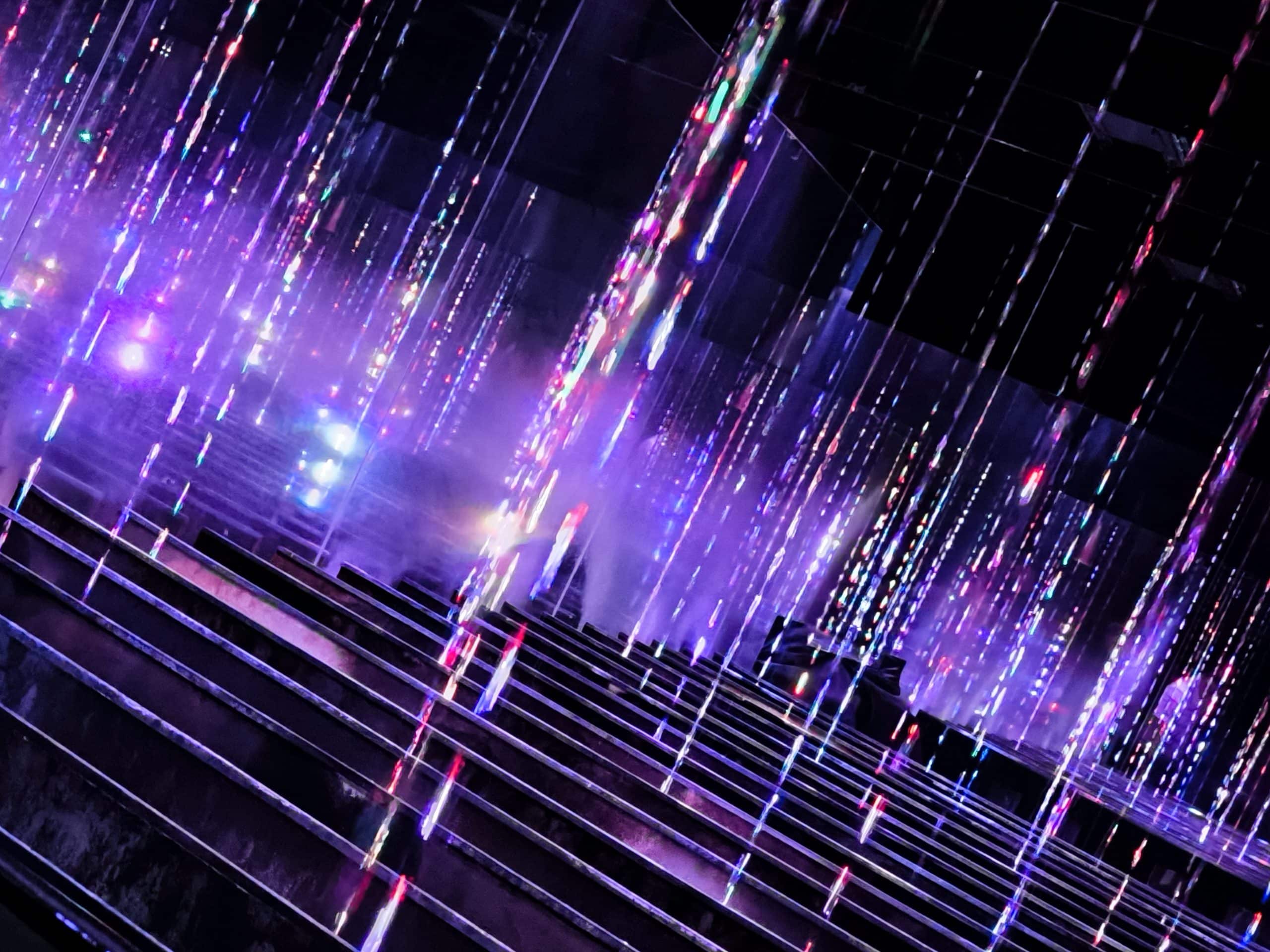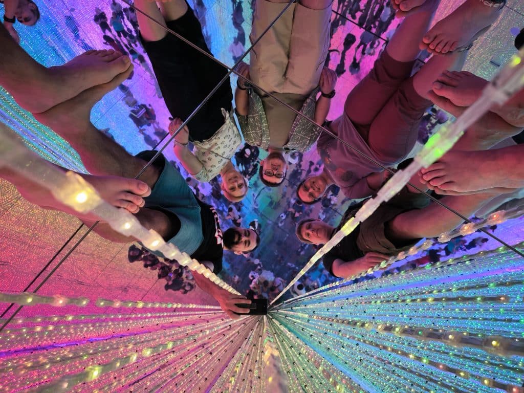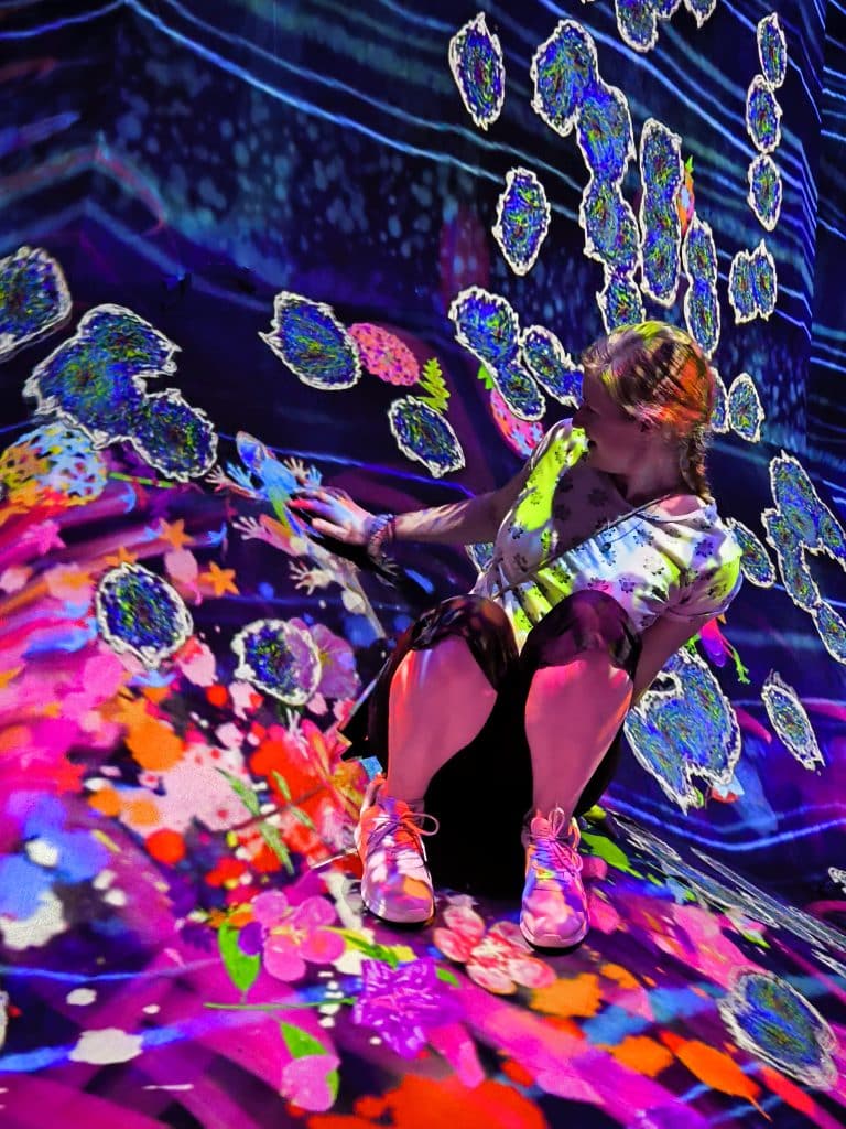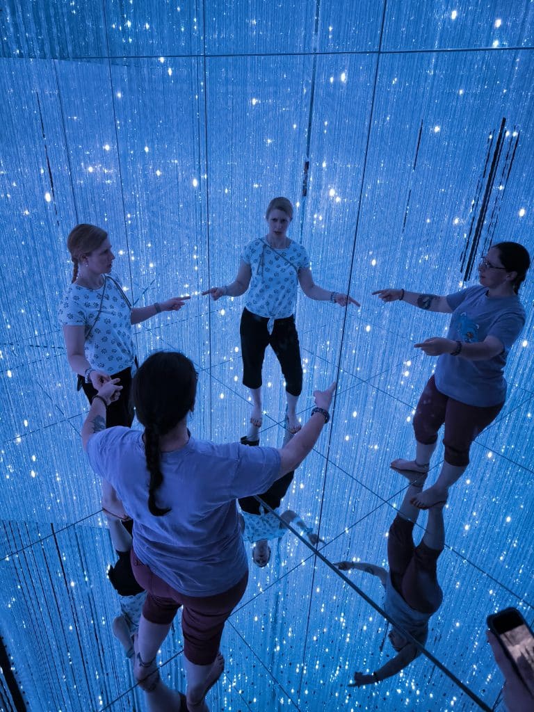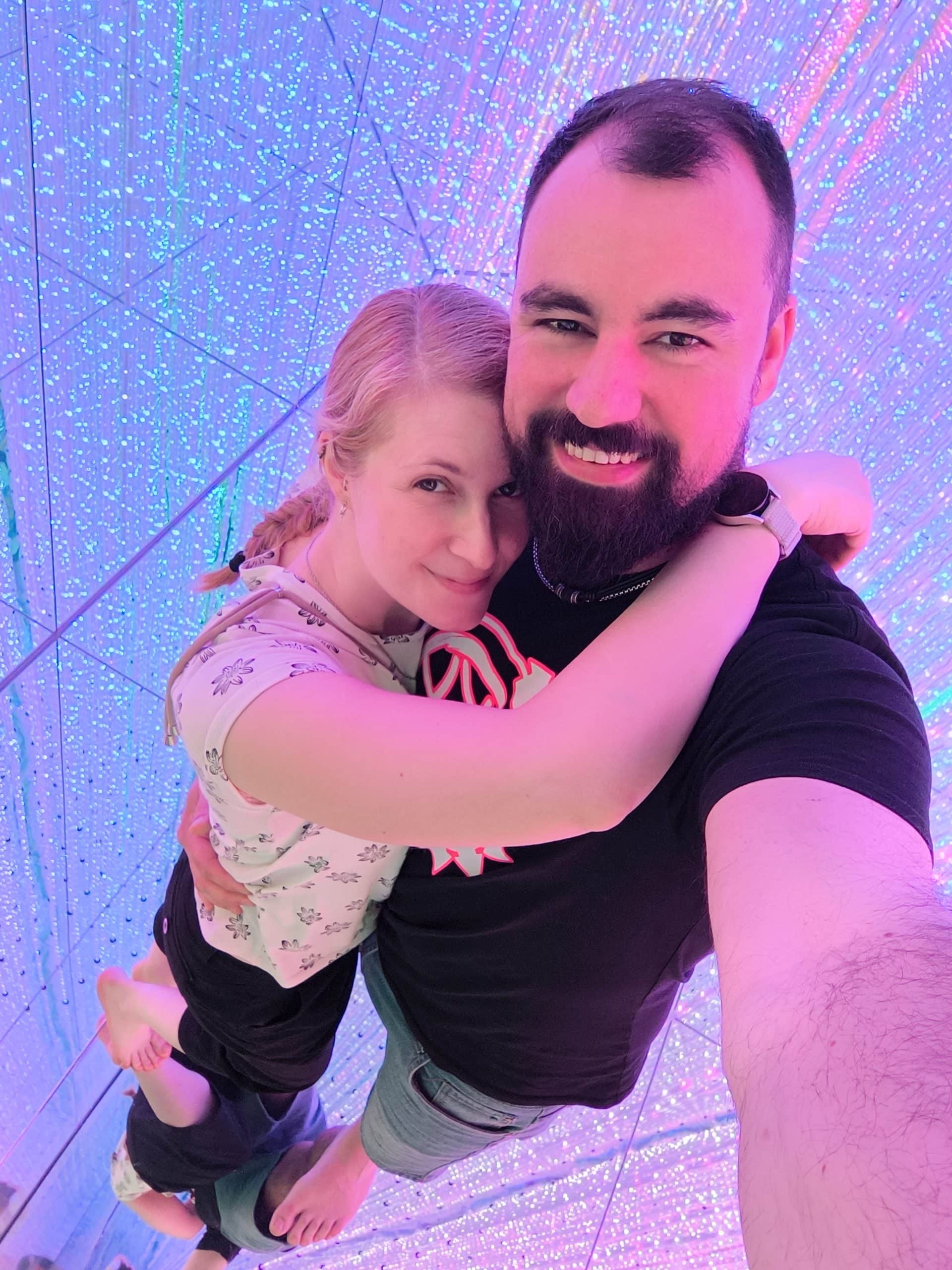 The infinity light galaxy and the carpy water were still the best rooms, but this time they also had a giant bubble room. This huge mirrored room had maybe 100 Mini Cooper-sized white silicone inflatable balls that hummed and changed colour. This really brushed up against Aimi’s balloon anxiety, but after we bounced them around for a while, they proved sturdy enough to take a beating without popping. I even belly-flopped onto one and it survived.