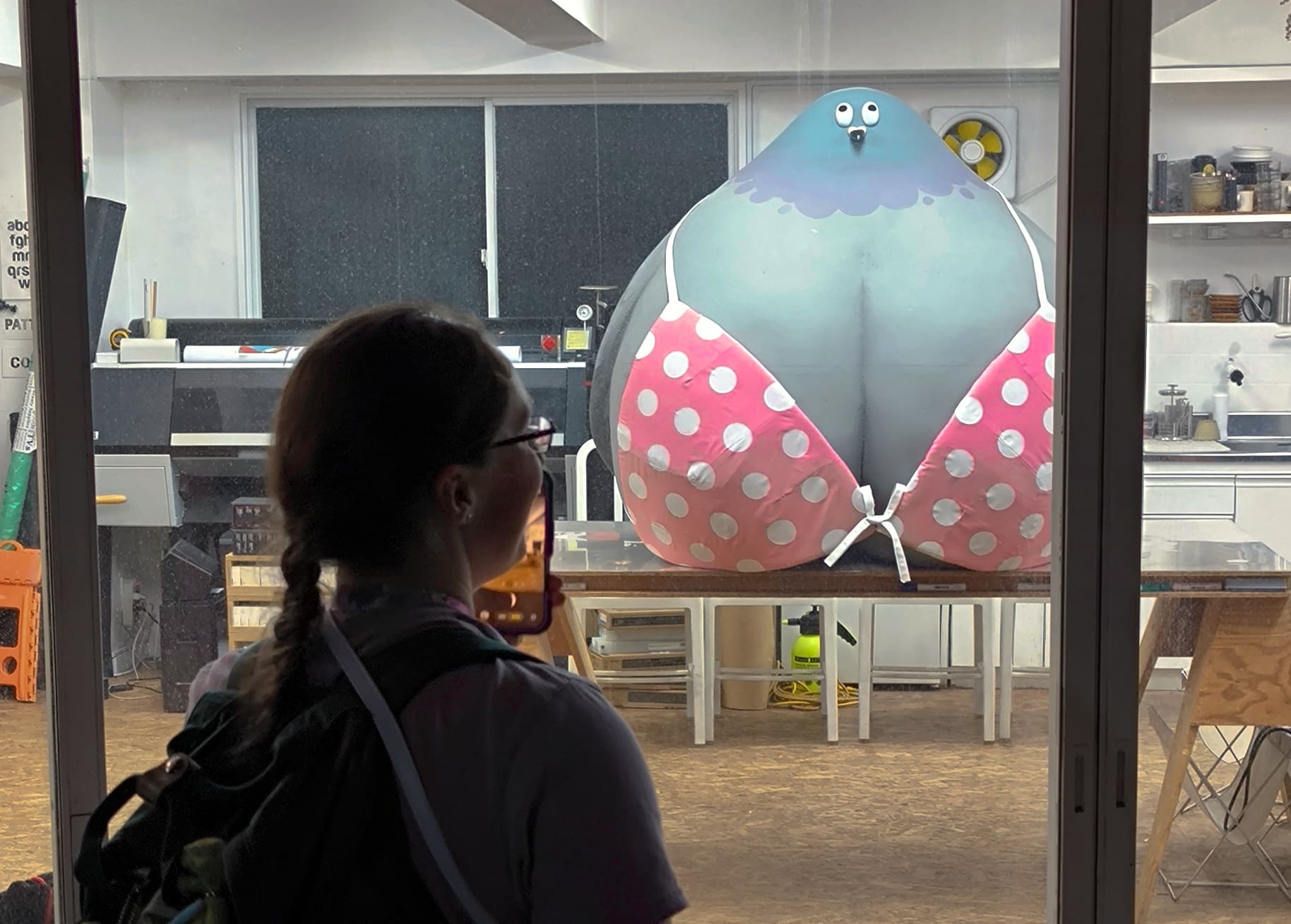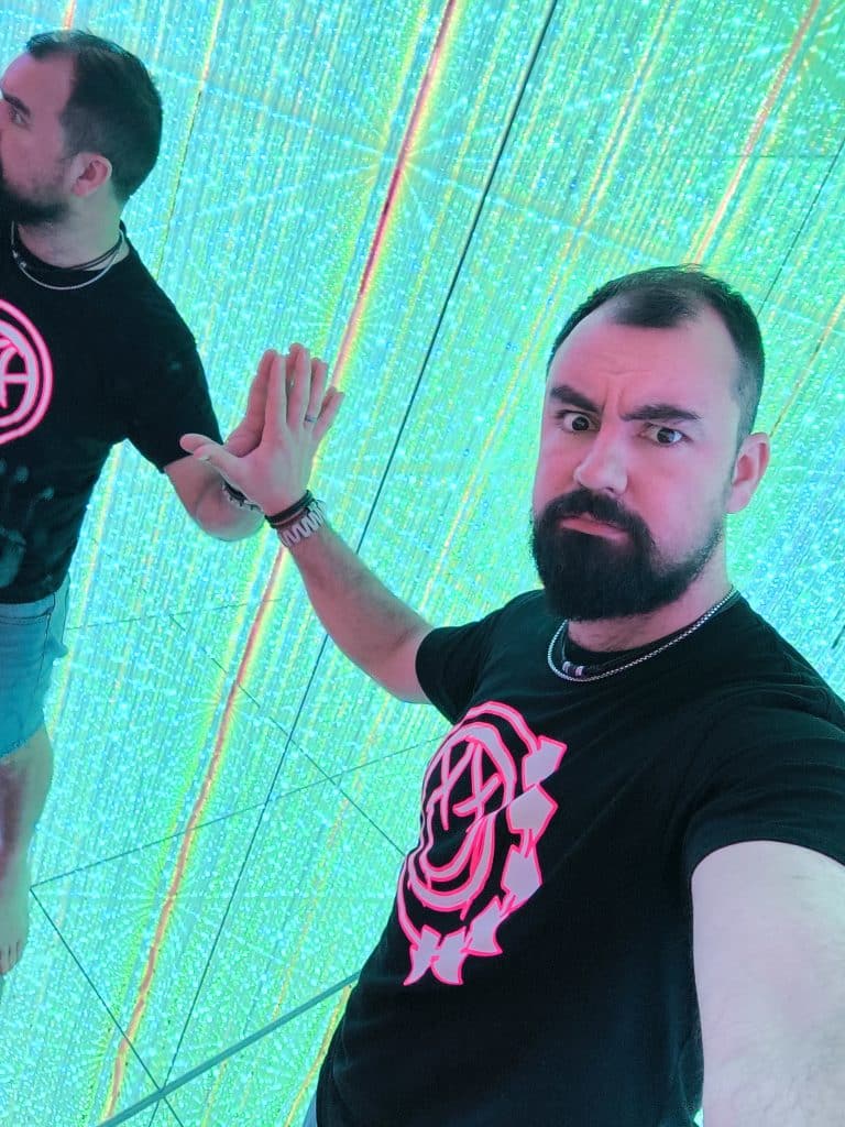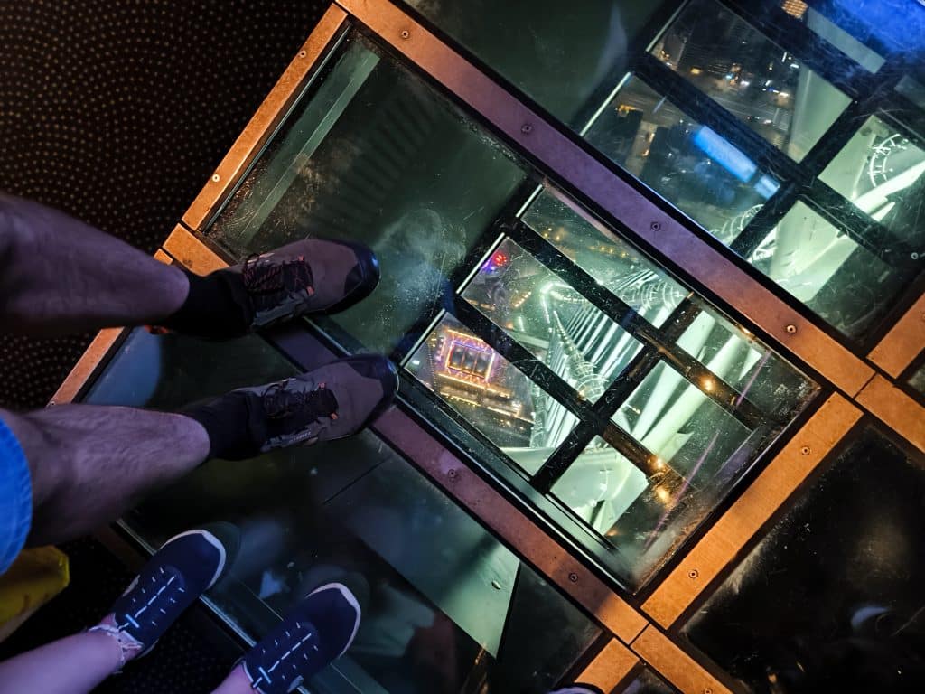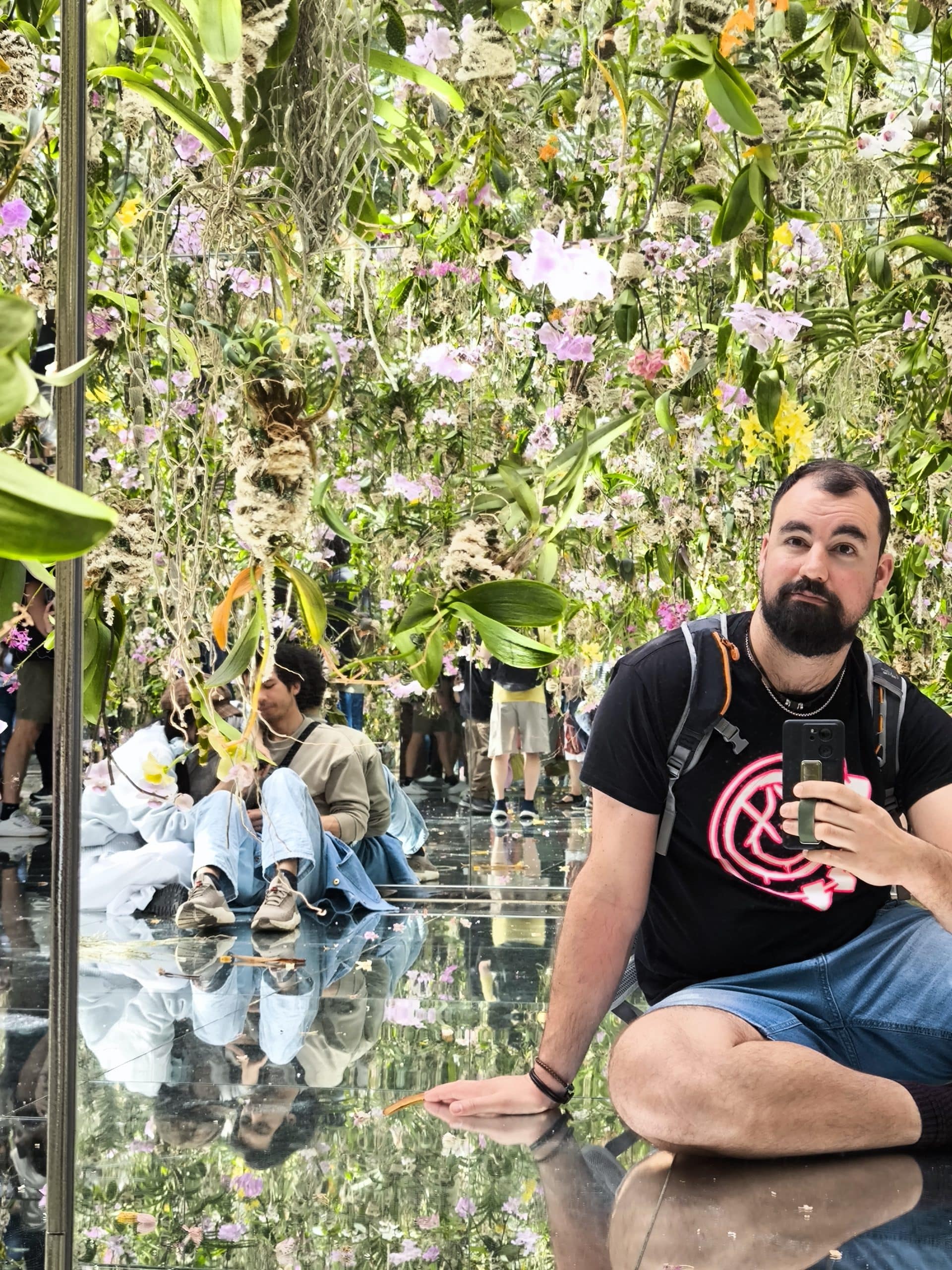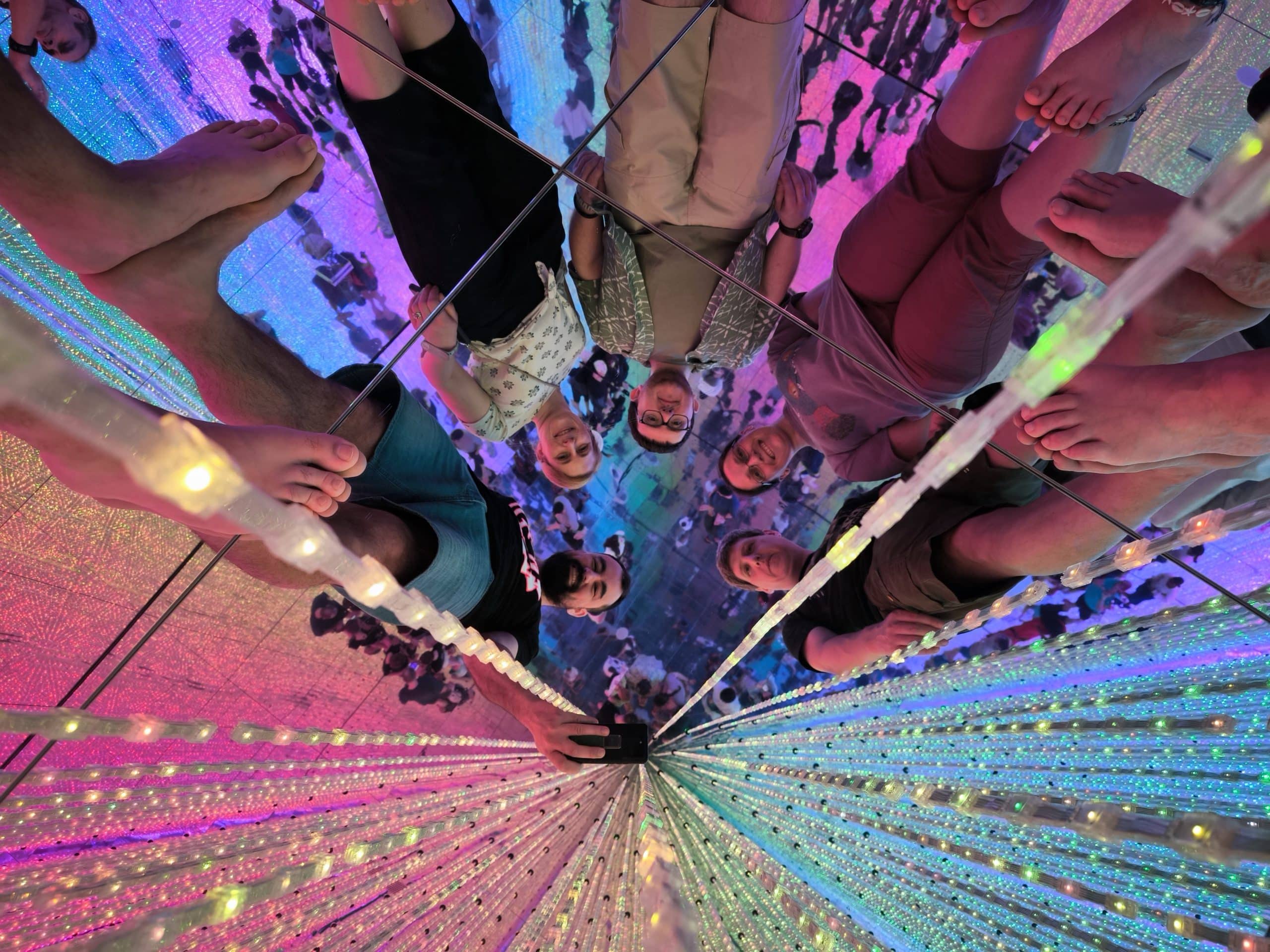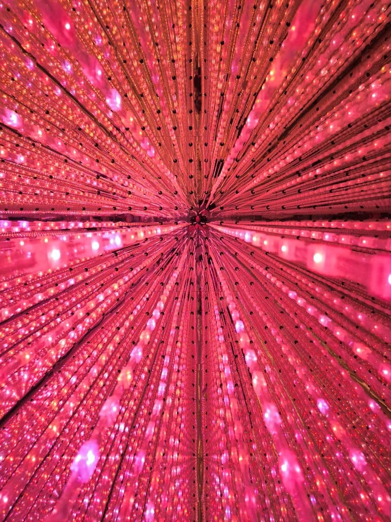 The infinity light galaxy and the carpy water were still the best rooms, but this time they also had a giant bubble room. This huge mirrored room had maybe 100 Mini Cooper-sized white silicone inflatable balls that hummed and changed colour. This really brushed up against Aimi’s balloon anxiety, but after we bounced them around for a while, they proved sturdy enough to take a beating without popping. I even belly-flopped onto one and it survived.