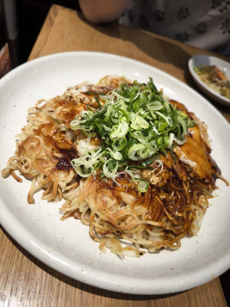 Instead, we found an okonomiyaki shop, which is something I wanted to have this trip anyway. It’s poor-person food, but tastes super good to me. A pile of pancake, noodles, egg, okonomiyaki sauce, cabbage, and spring onions—it’s fried in a big pile on a flat griddle. We got a selection set with a few other bits, and it really hit the spot.