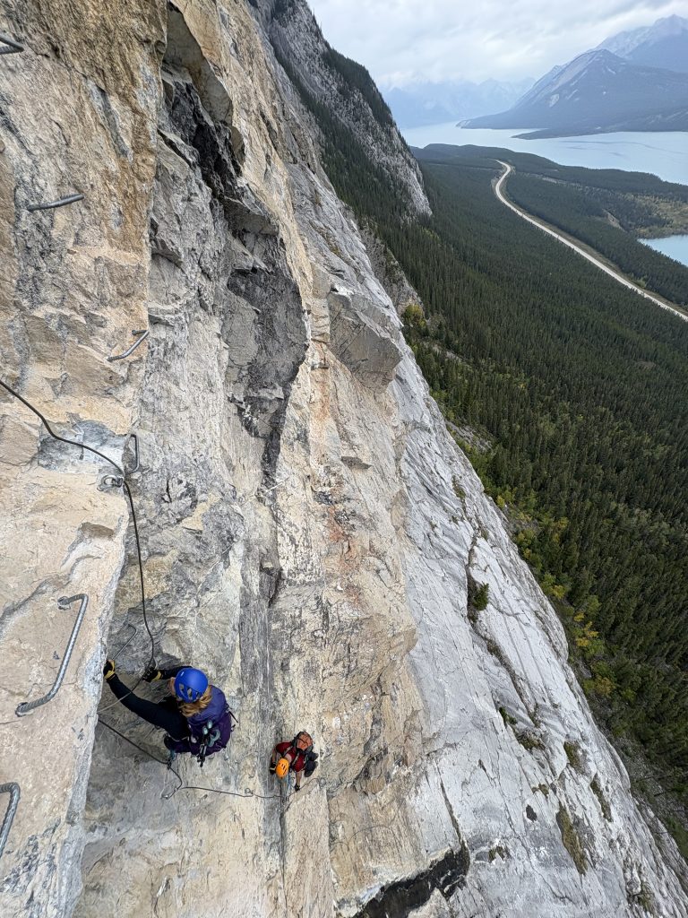 The first section was intentionally blank and hard. Basically a 30m layback using the cable and friction of your boots on the rock. It took a lot of upper body strength to muscle up thru it but then the rungs started and we got into the stride of it.