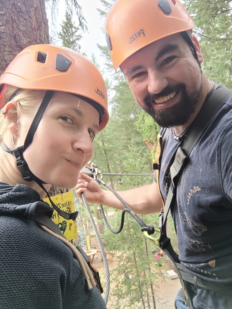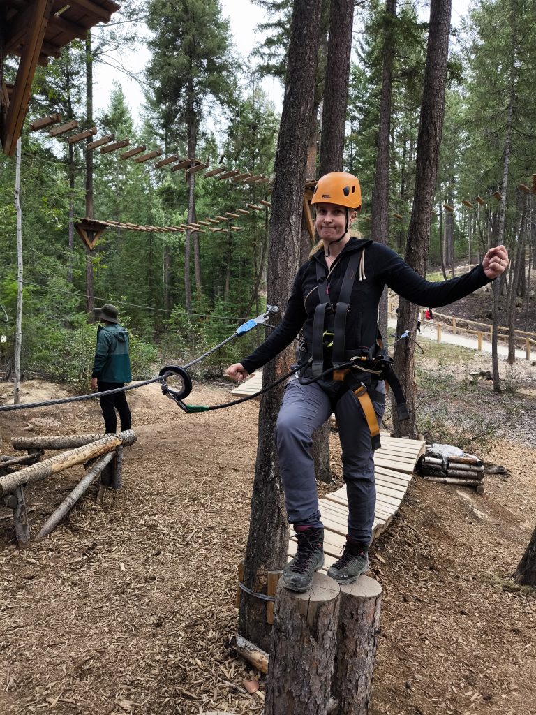 Physically it got hard after the first couple features, including a cargo net vertical tunnel, a rope ladder climb and a zip line. Then we were faced with a set of disks suspended on ropes. This honestly had us both hanging from the safety cable as they danced around and required serious grip and upper body strength to move thru. Aimi being ill and me being a chubby fuck, both struggled and came out the other side sweating. Luckily the next few were more balance based until we hit the next hard one. And that was the pattern all the way to the freefall at the end, other than Aimi slamming into a tree and giving herself a deep purple bruise on her leg!