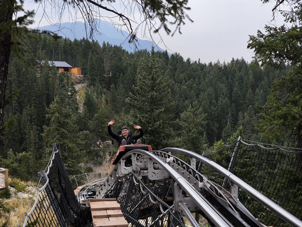 Next up was the mountain coaster. This was really good fun! A 1.5 person rollercoaster that winched you to the top and set you rolling on your own. Then you had handles to control how fast it went. Some people took it sedately, but we both just kept the brakes off and went as fast as possible. Honestly it was a little scary how rattly and fast it went. But maybe if you aren’t trying to out-man your wife you could take it slower and enjoy the ride sweeping thru the trees a little more. It might actually be a good ride for mum to get used to a roller coaster as she could go as slow as she wanted until she got used to it.