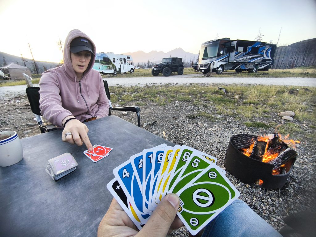 Watching the sun go down, we actually got to use our camp chairs for once. All the other places we had stopped it was either too late or riddled with mosquitos preventing us using them. Here, it seems one of the benefits of the apocalyptic wild fires are the lack of mosquitoes! This made playing Uno, eating crisps and having hot chocolate in front of the fire much more enjoyable.