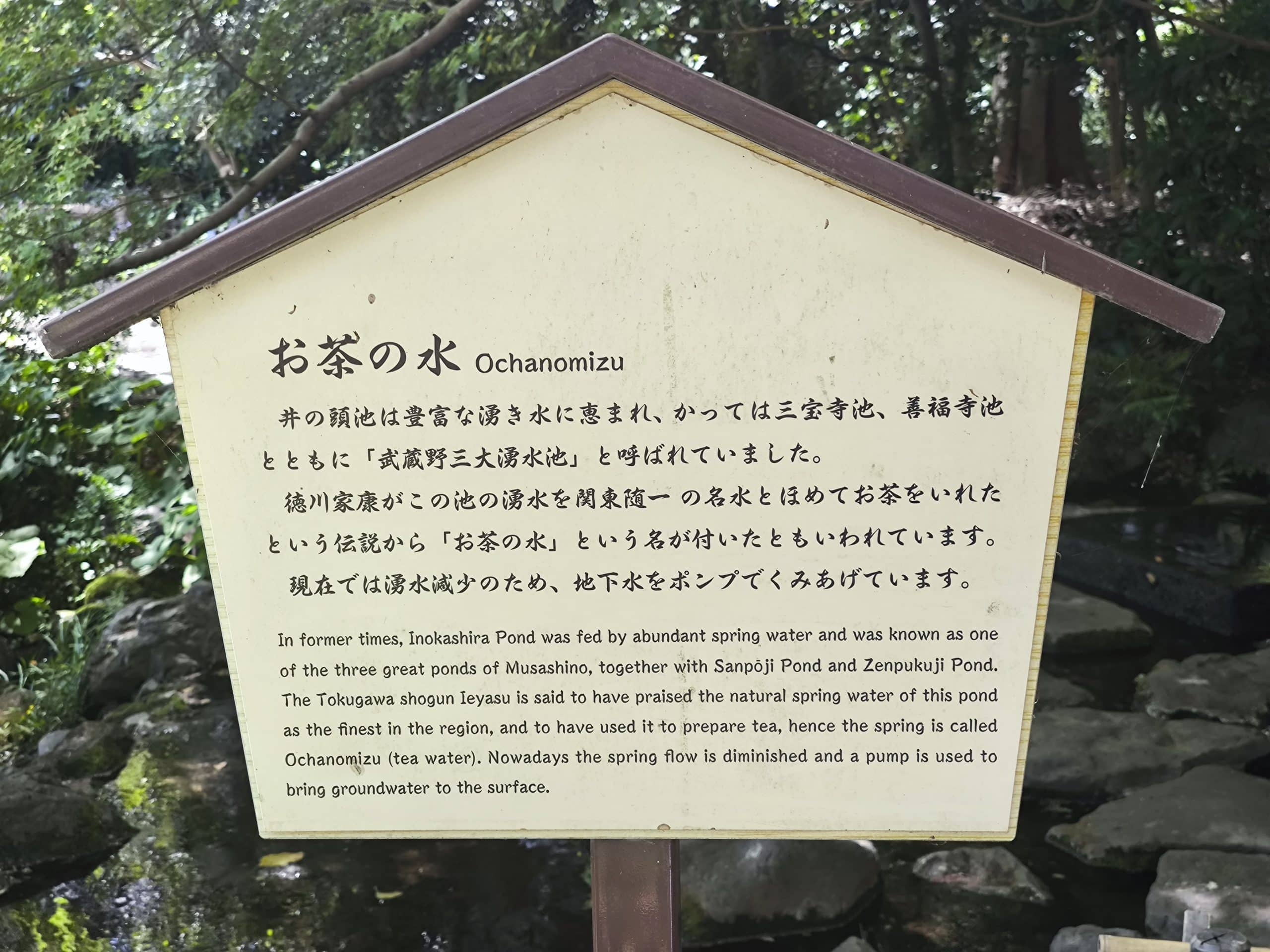 After an hour’s train ride out of Tokyo, we headed out of the station, briefly through a busy street and straight into a nice park. The pond water now gets pumped up from underground, but there was a plaque next to the source saying the pond is called “Ochanomizu”—literally translating as “tea water” due to the springs clarity and purity. This area surrounding the original spring has settlement ruins from 3,000–4,000 years ago!