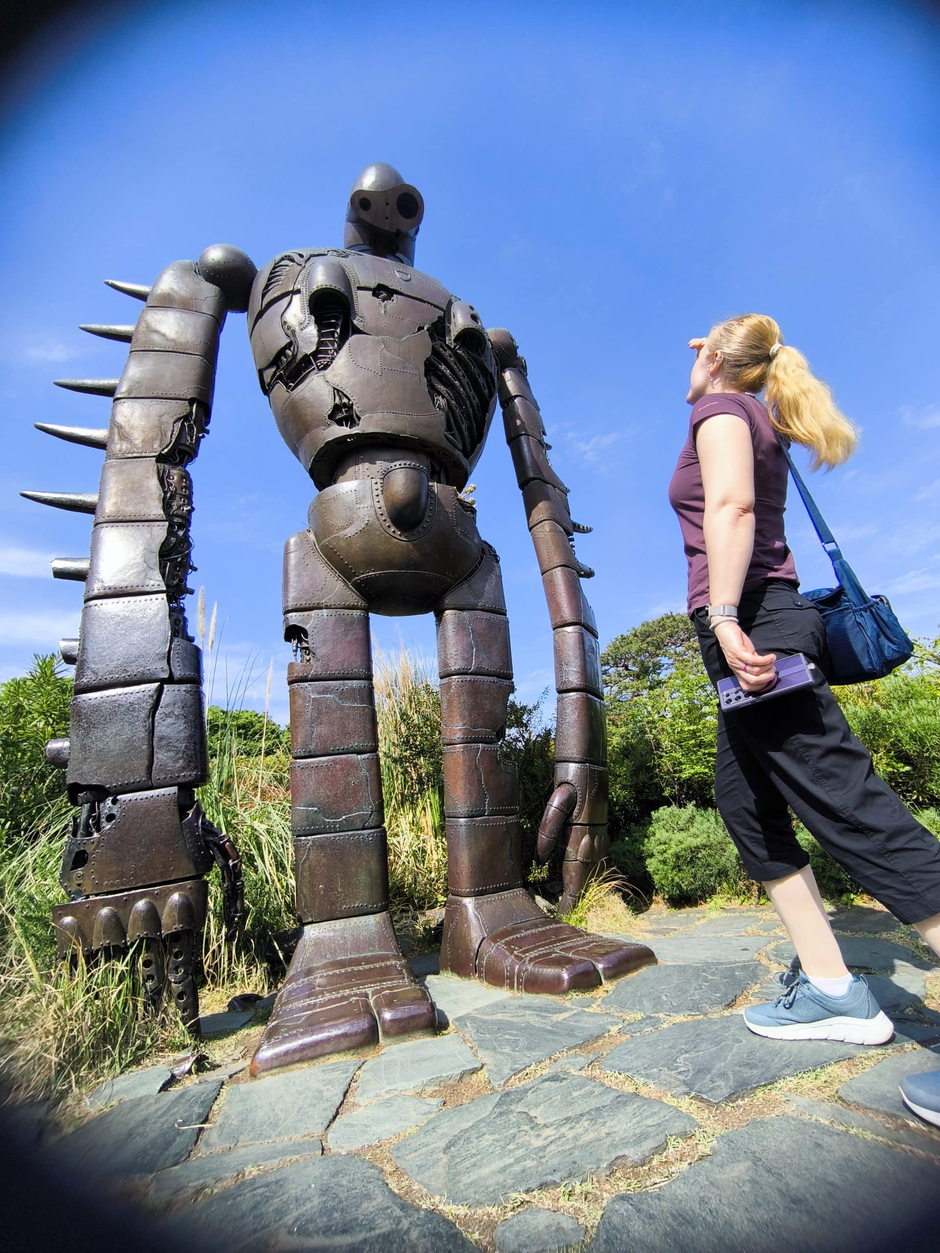 First whimsy I couldn’t resist was to take the tight spiral staircase from the centre of the atrium right up to the top floor. It’s all black iron and wood treads and no wider than 1.5m in diameter, so it’s really tight inside. This deposited us high up on a balcony overlooking the space. We took a hobbit-sized doorway out onto a wooden staircase that led us up to an outside balcony and then another spiral metal staircase covered in vines up to the roof. Here, a huge statue of the robot from Laputa: Castle in the Sky looms over the museum.