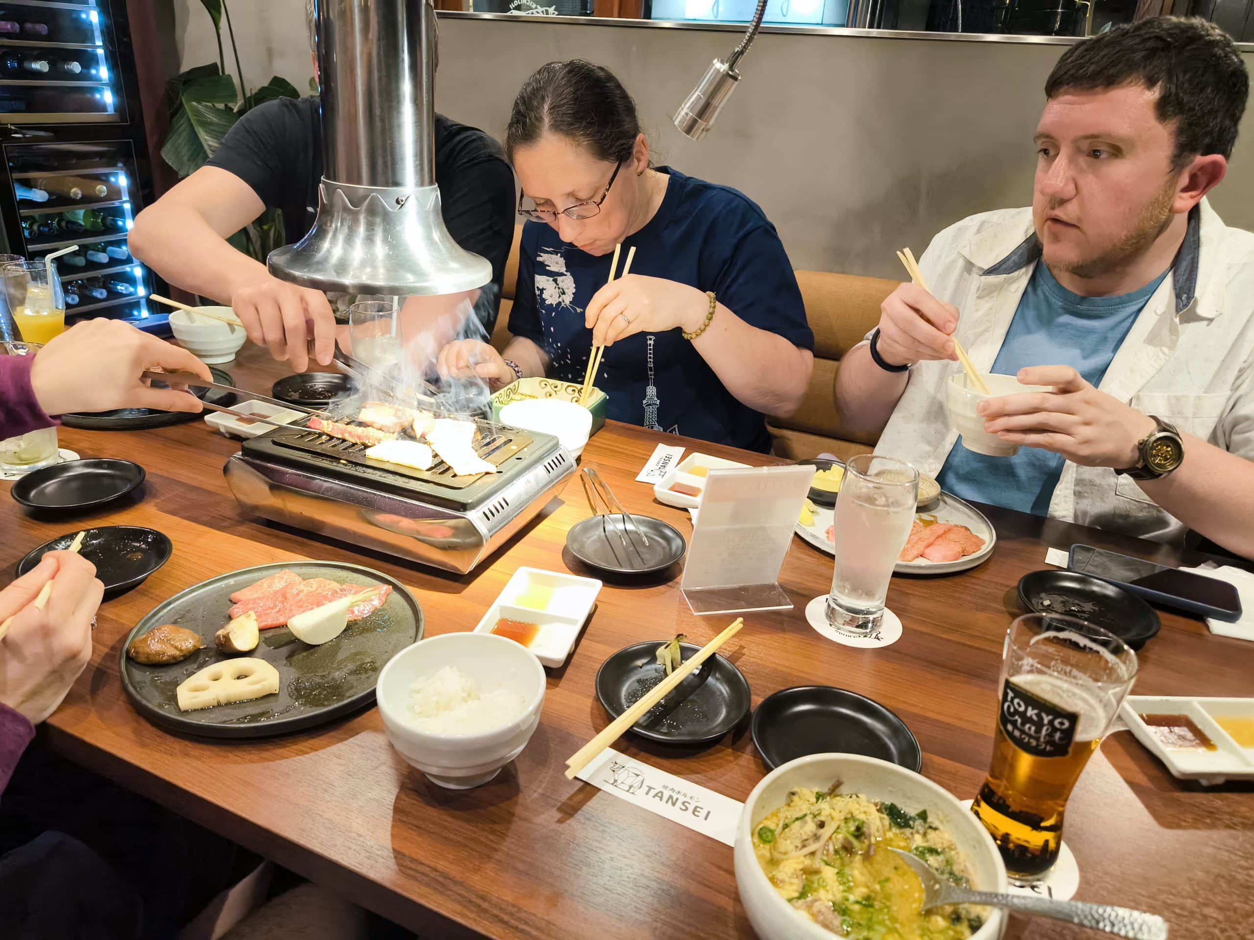 On the walk back to the train station, I stopped twice to fail at finding geocaches. Luckily, on the third attempt I found it and left my mark before we got dinner. Nathan had said he really wanted to have a go at grilling meat at the table, so when we passed one we decided to eat there, rather than back in Tokyo centre. And we are glad we did—it had only opened in February, and they were very hospitable and welcoming. Aimi ordered an alcoholic green tea and said it was super strong, so after that she was very excited to go out on the town. But it was already 9pm, and the train ride back sobered her up to the reality of sleep deprivation.