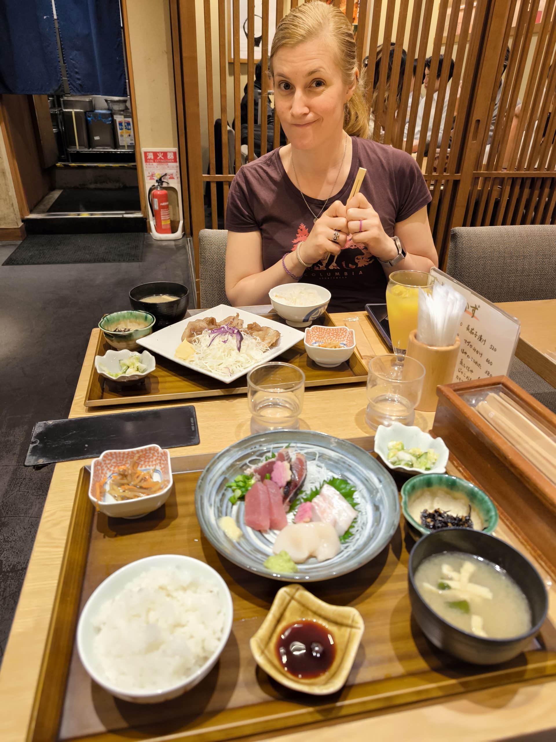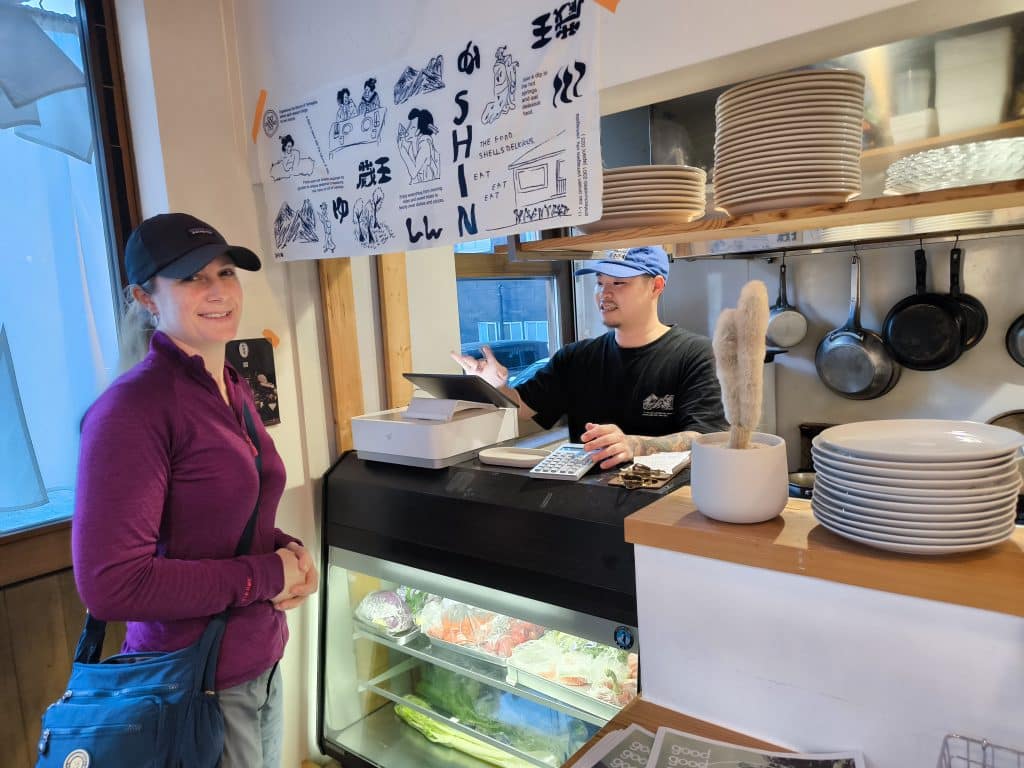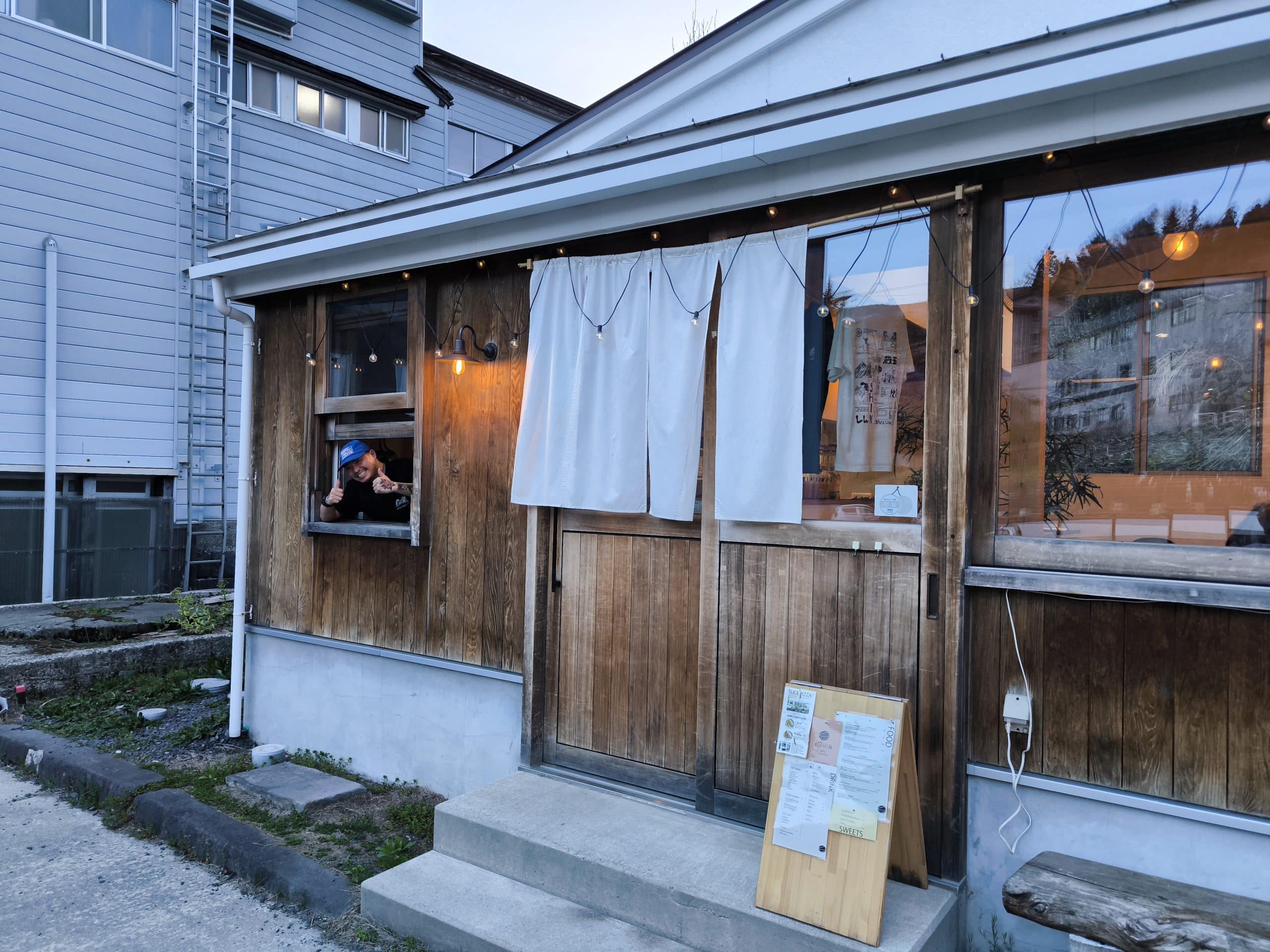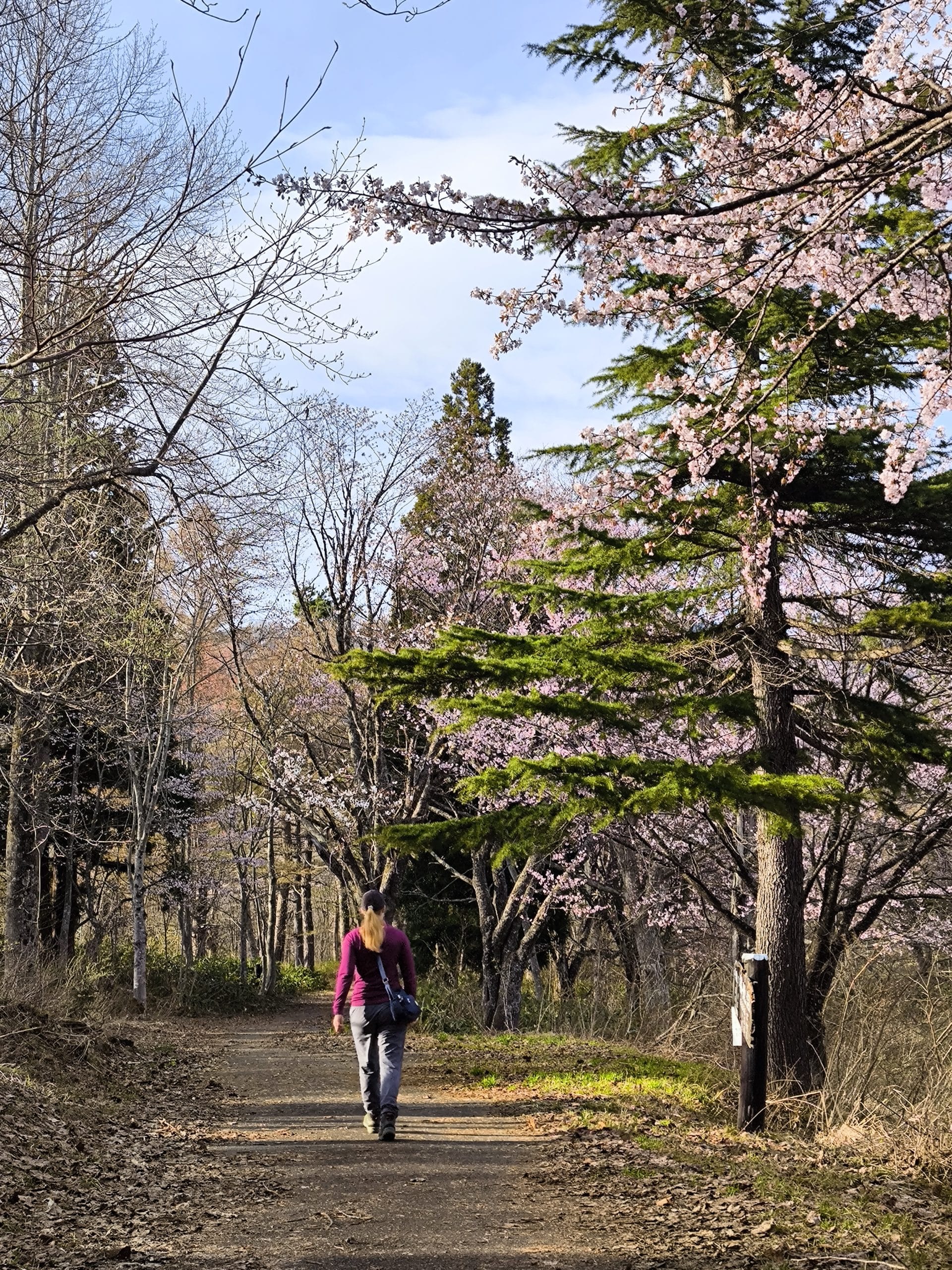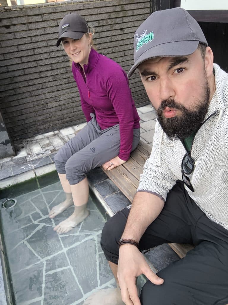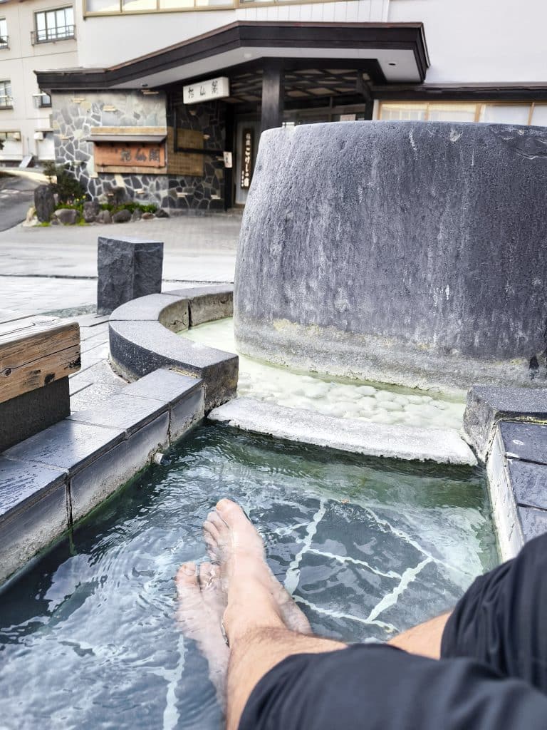 Arriving at the hotel, it felt absolutely deserted. This is clearly a ski resort town in the off-season. We took a short walk around a nearby lake to see the cherry blossom before heading into town. As an onsen town, there is the whiff of egg in the air as the hot water escapes the earth and brings with it sulphury minerals. It seems in this town it’s normal to have foot baths dotted around. Here we stopped and refreshed our tootsies before continuing our search for dinner.